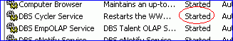 Op de computer waar de webserver is geïnstalleerd moet de DBS Cycler Service gestart zijn. U kunt dit zien door de Informatie over Talent op te roepen in het Help-menu of door te dubbelklikken op de bovenste balk van de webapplicatie (de balk met de naam van uw bedrijf). Bij het item CyclerService staat dan running vermeld. Uw systeembeheerder kan de service zien staan in de lijst van services: